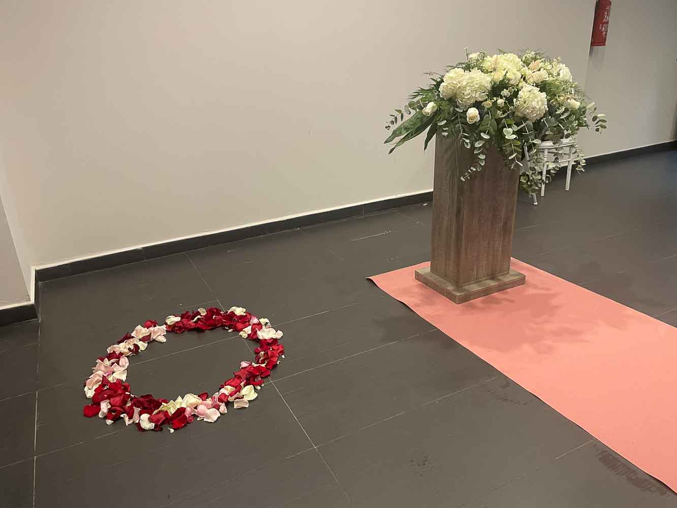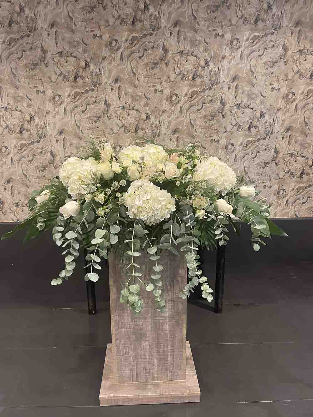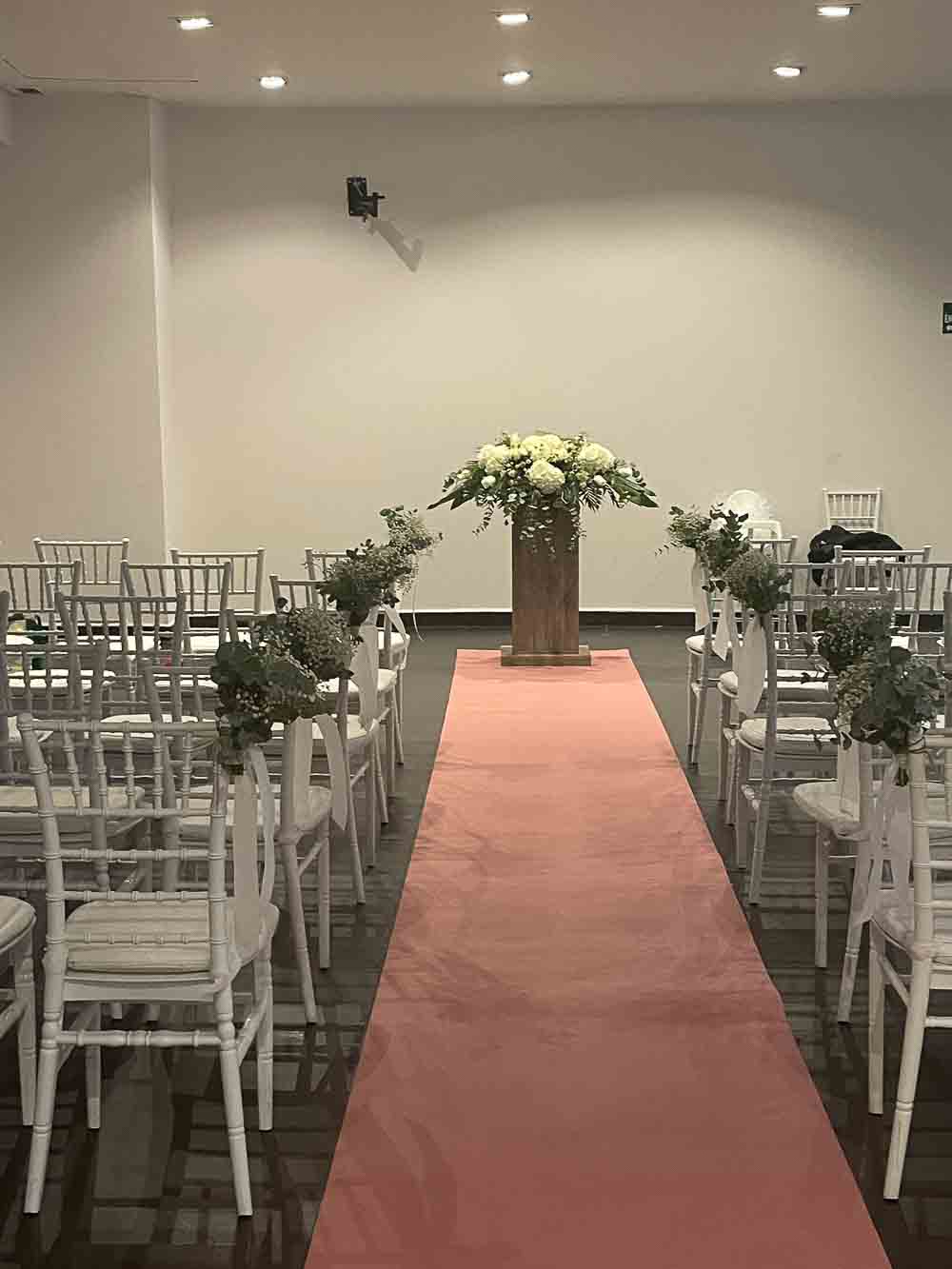 Boda civil en interior de Magna garden donde predominan las hortensias en blanco y los tonos rosas