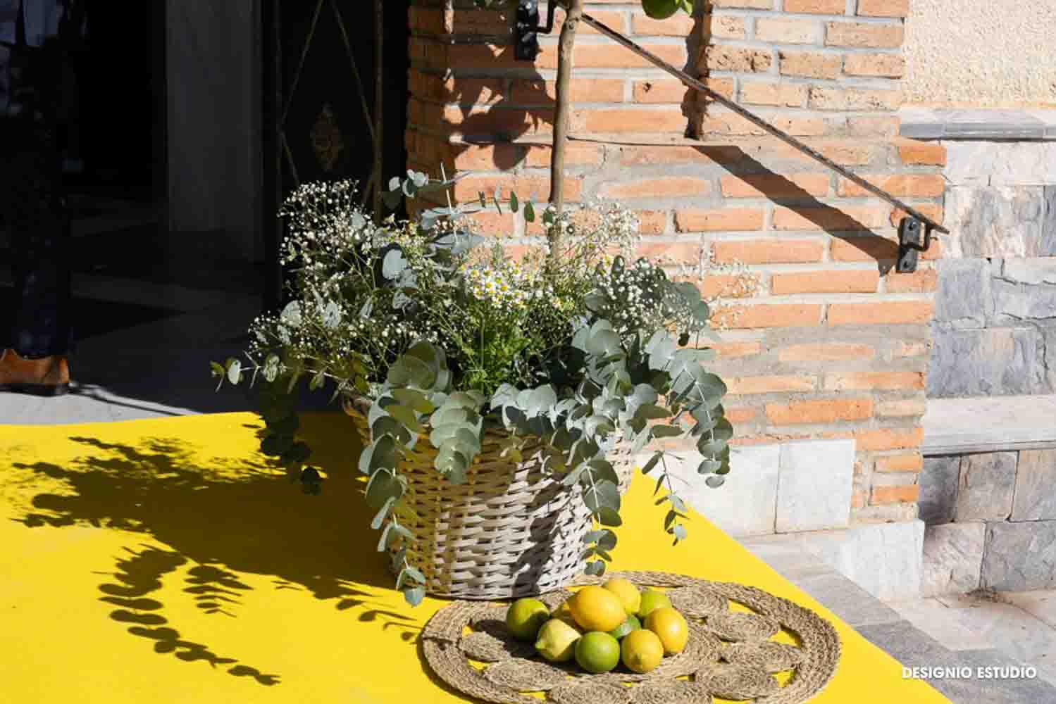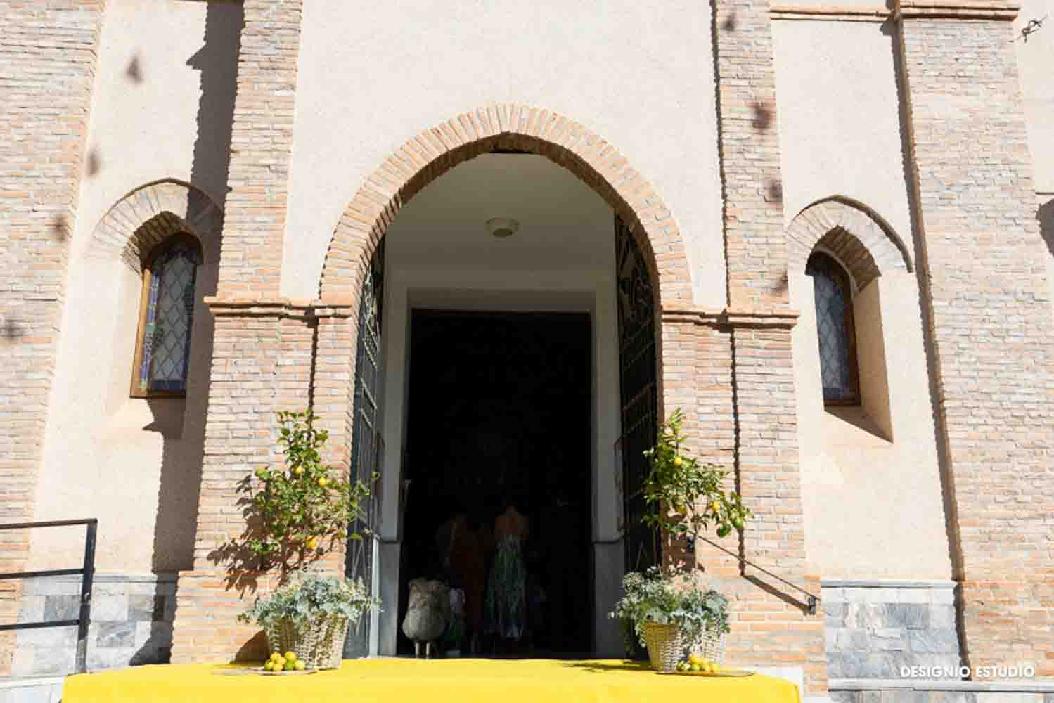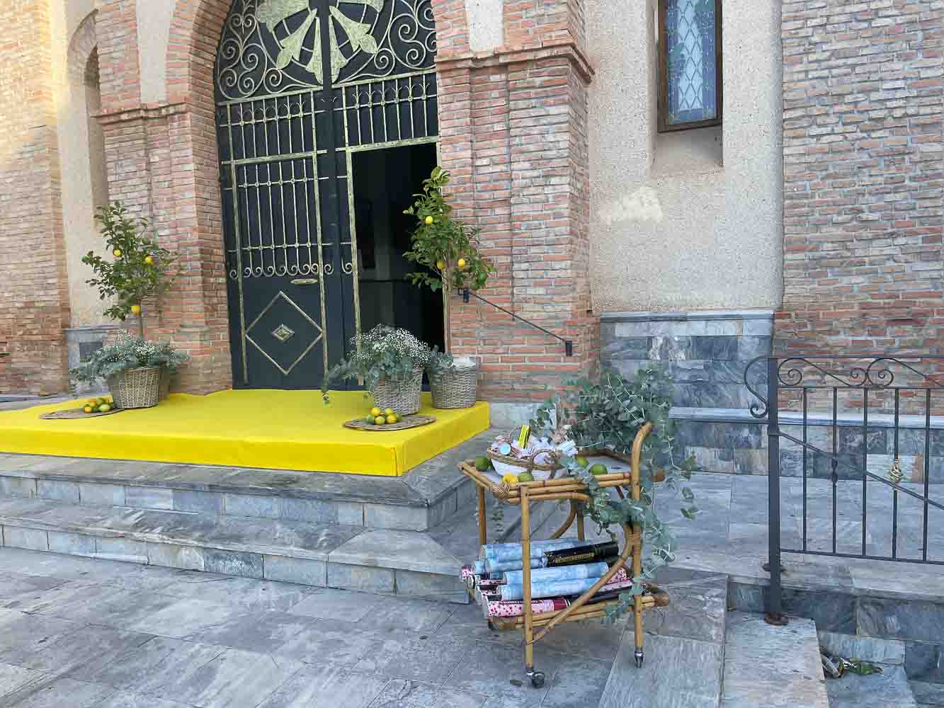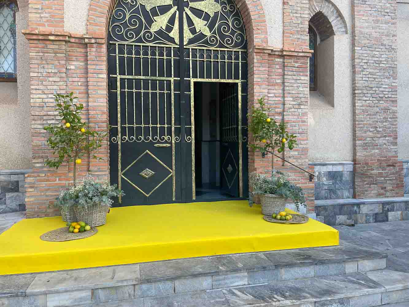 Decoración en exterior de iglesia de cabezo de torres con limoneros y predominando el amarillo