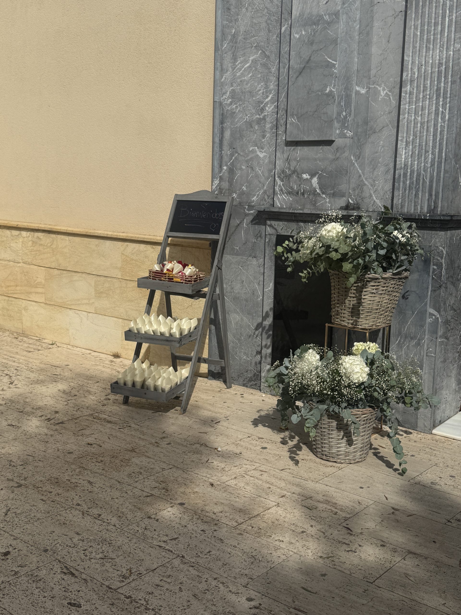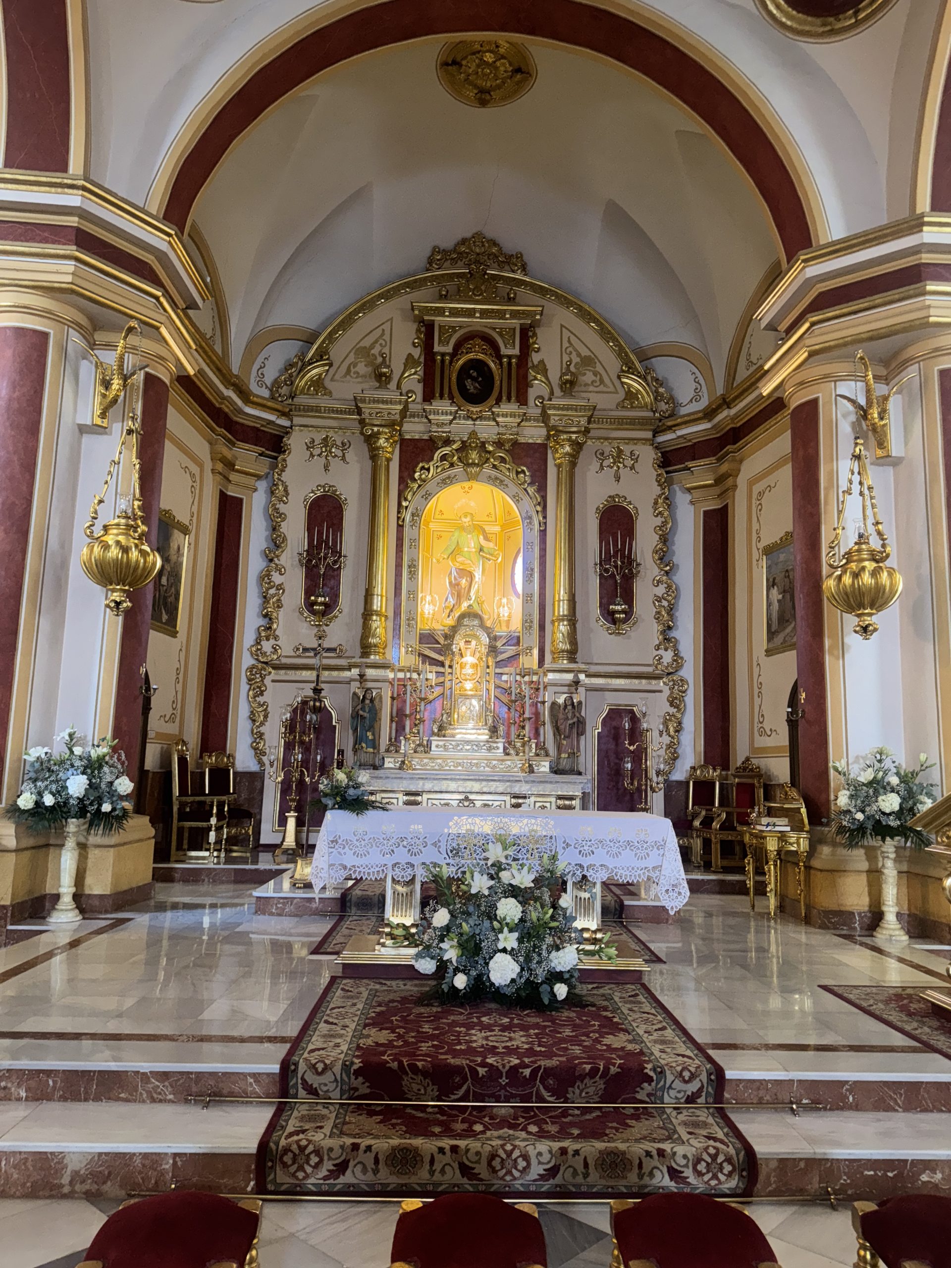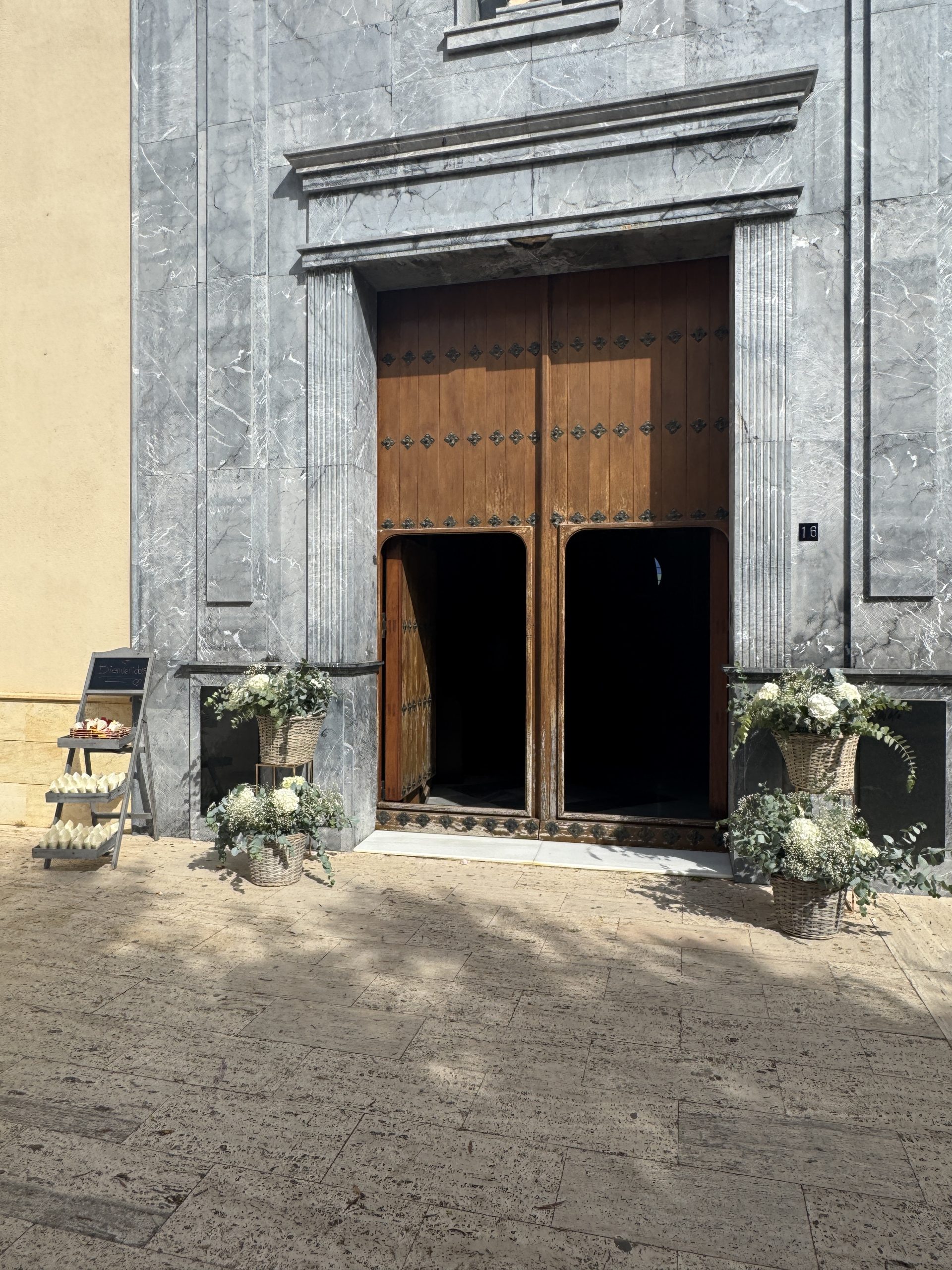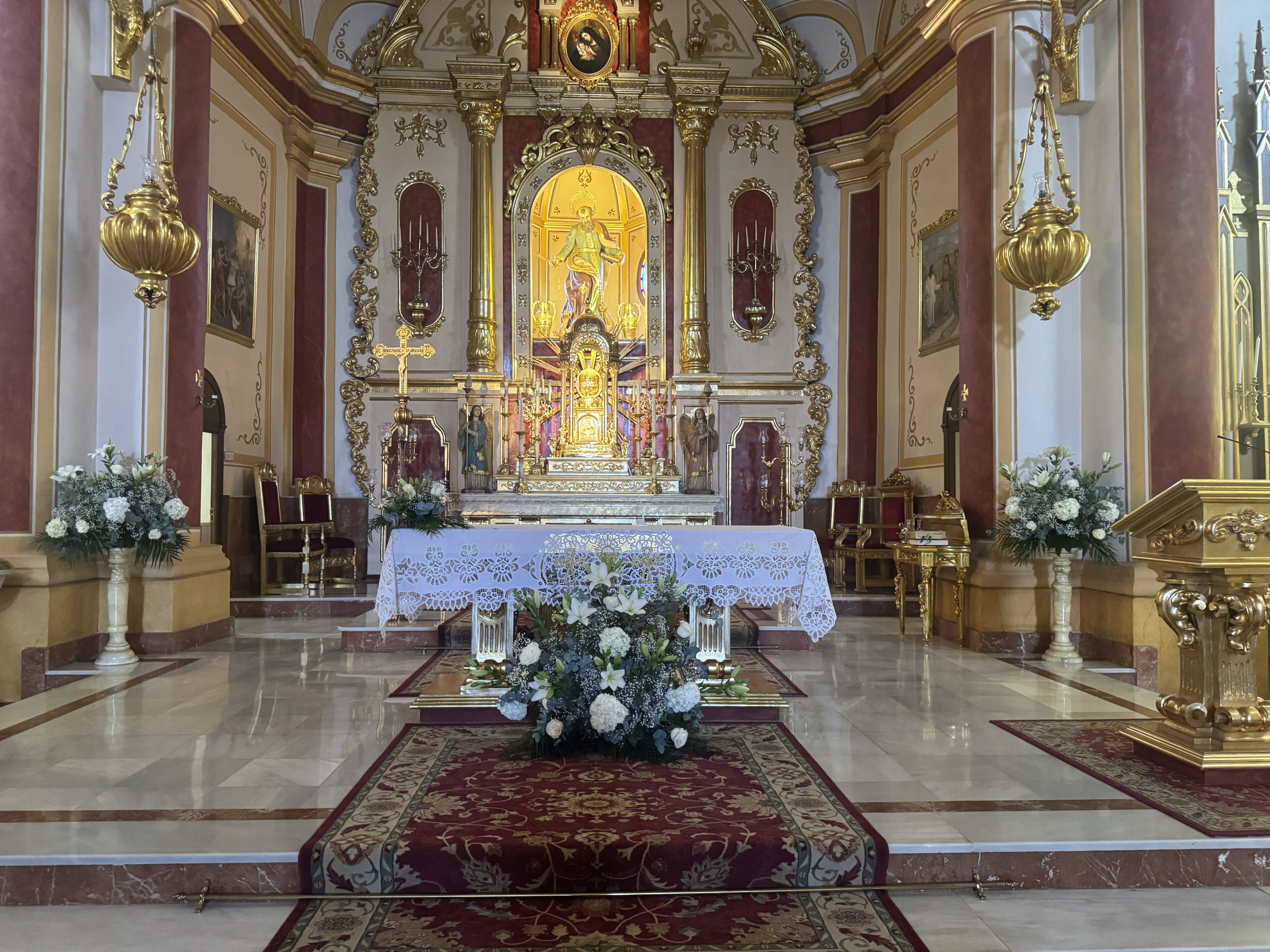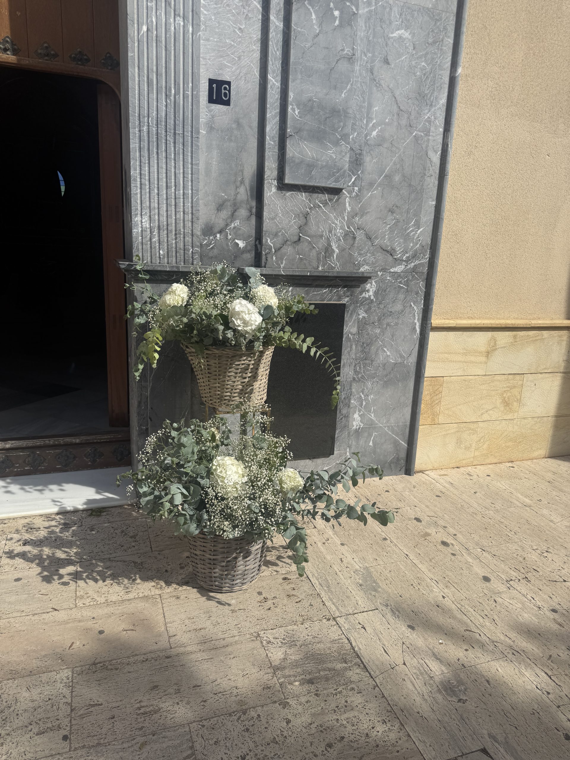 Interior y exterior de boda religiosa predominando el blanco con hortensias y eucalipto