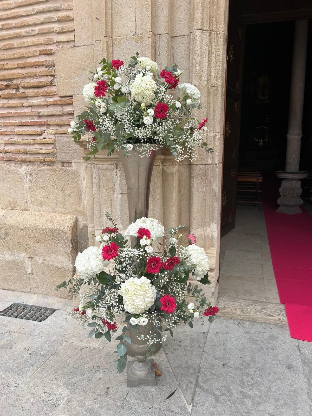 Decoración exterior con copas en dos alturas, entonos fucsia y blancos. En interior decoración floral sencilla siguiendo los mismos patrones de color