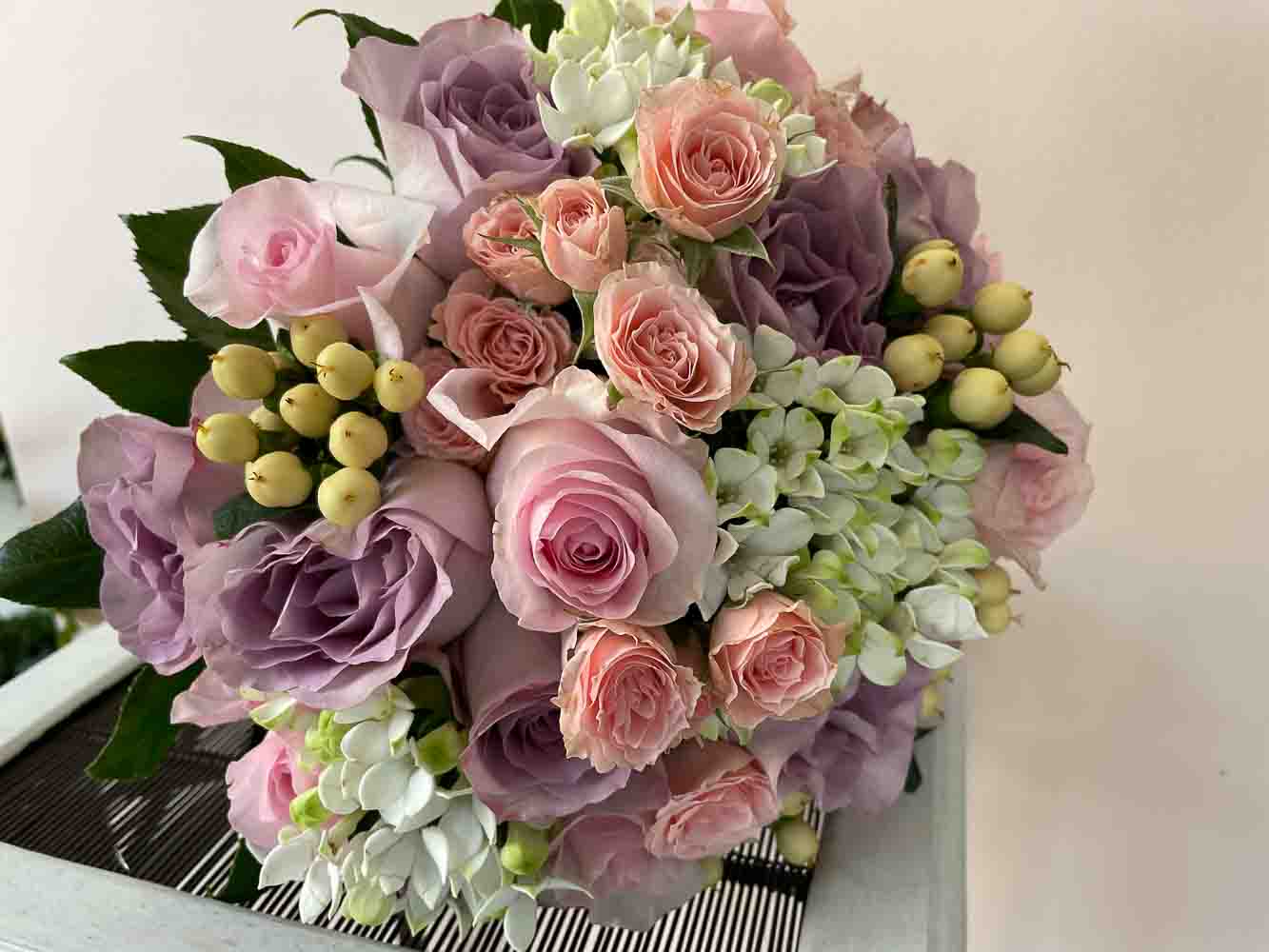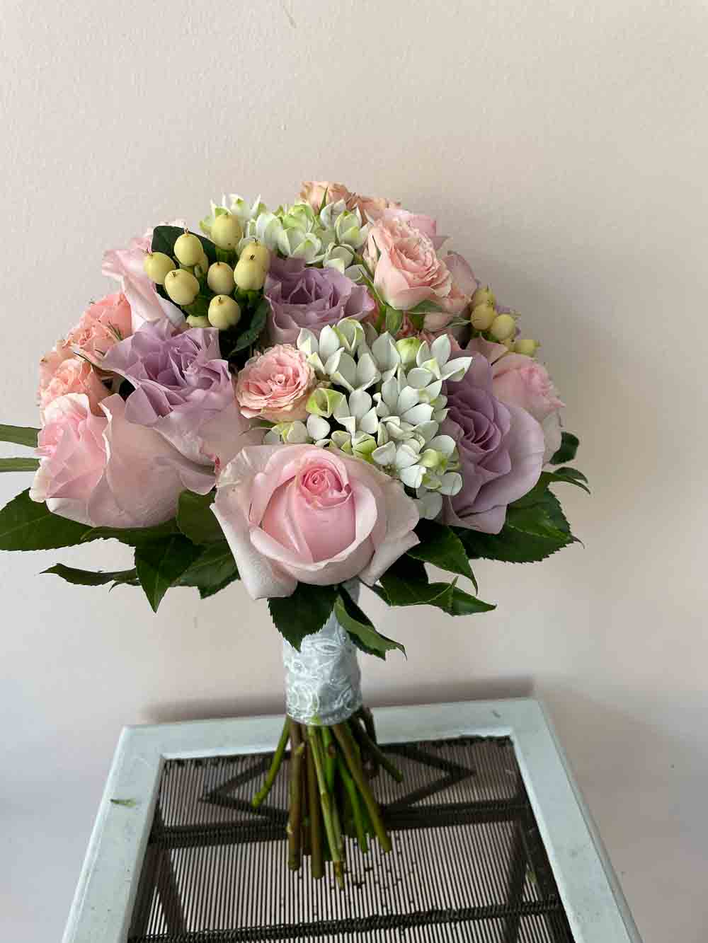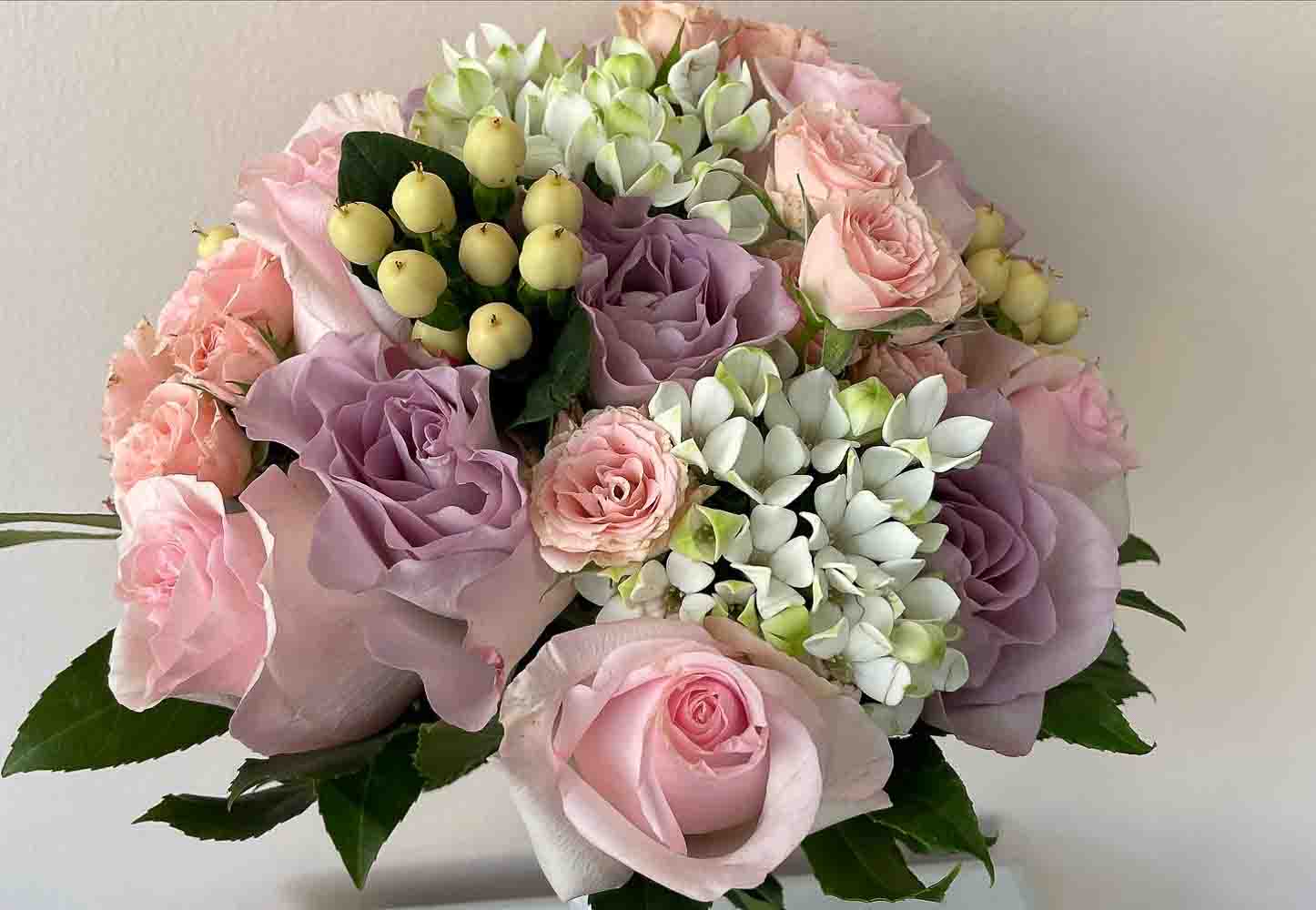 Precioso ramo de novia con variedad de rosas y flor en tonos pastel
