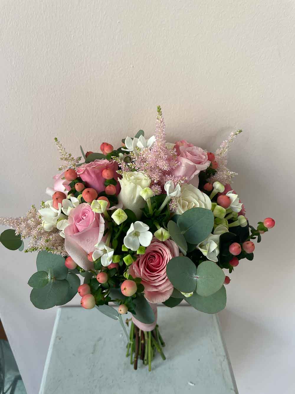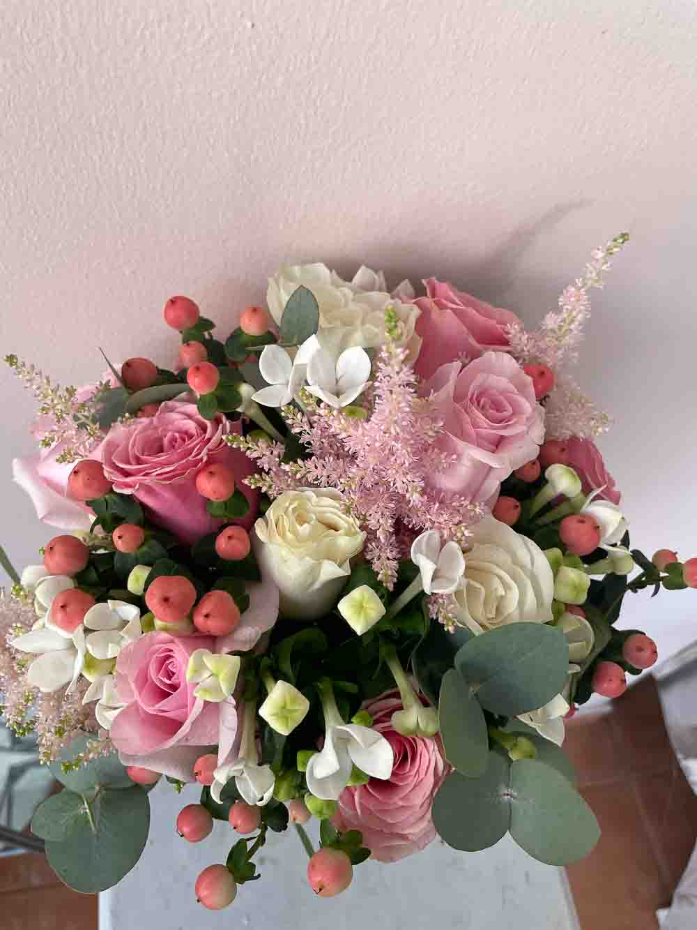 Ramo de novia de flor variada con toques rosas y blancos creando armonía y elegancia entre ellos.