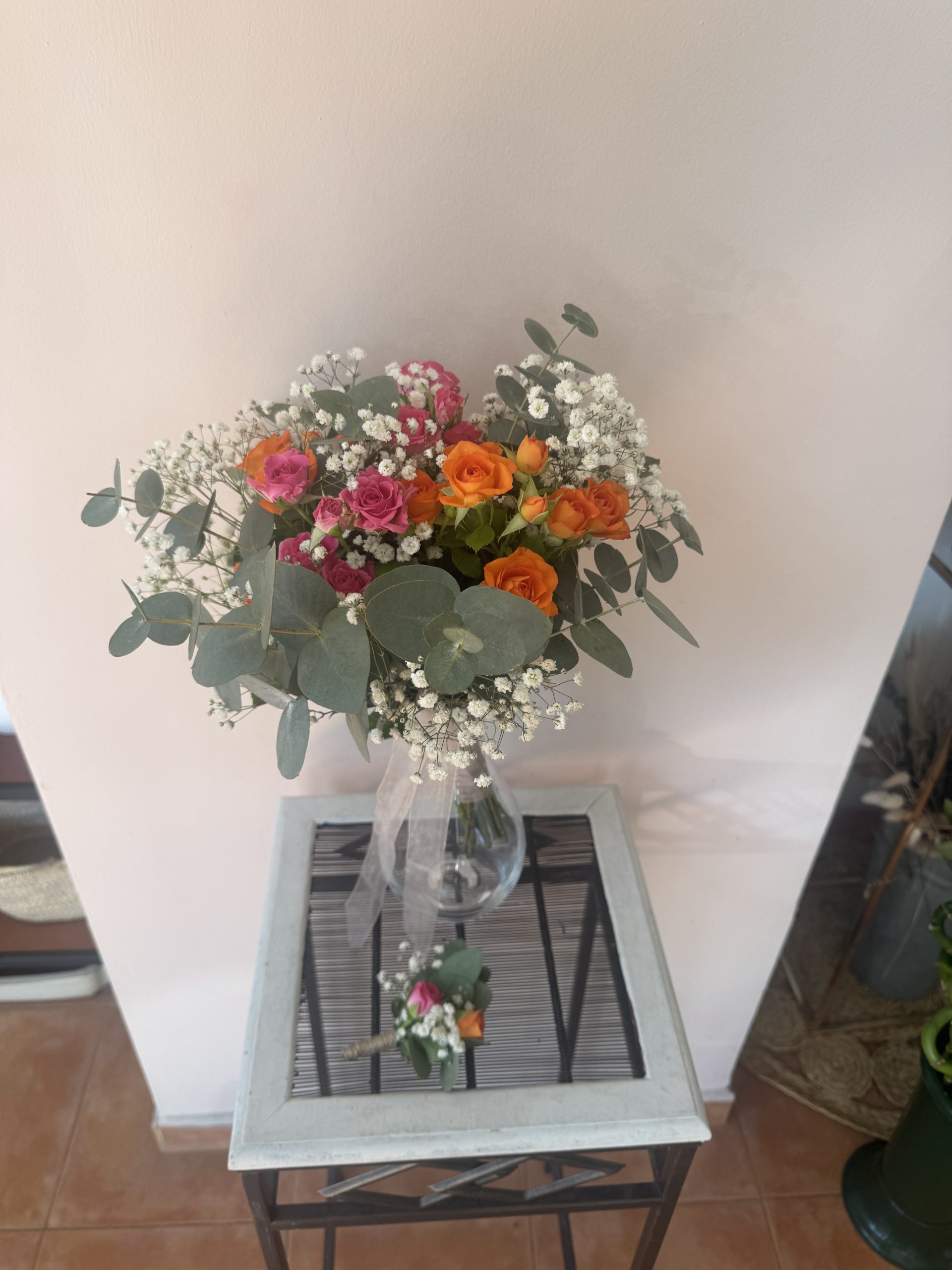 Ramo desectructurado con rosa ramificada en tonos naranjas y fucsias
