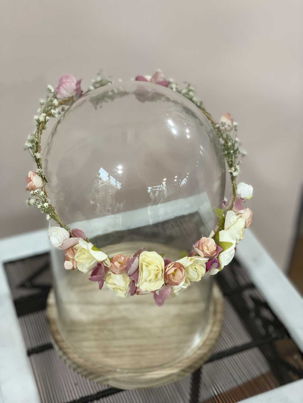 Diadema tipo corona con flor de papel, artificial y preservada hecha a medida