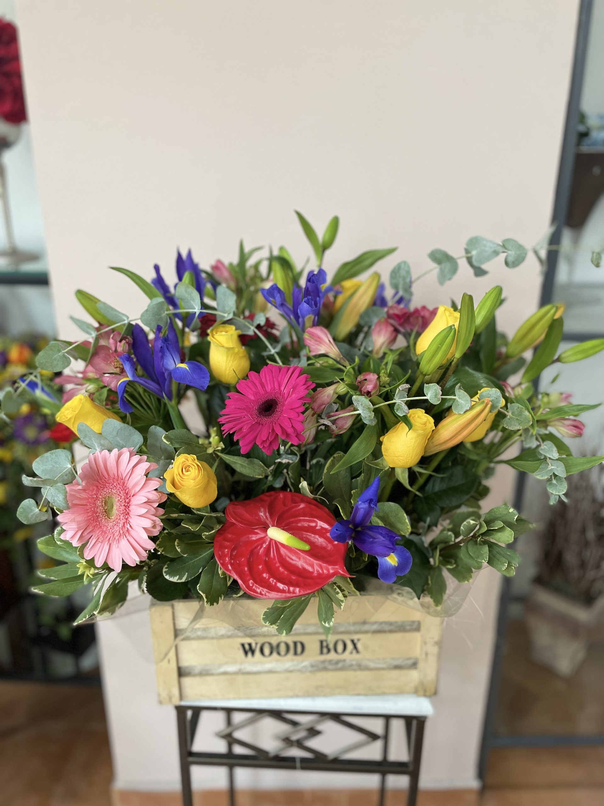 Centro con variedad flor de temporada en diferentes tonos en base de caja