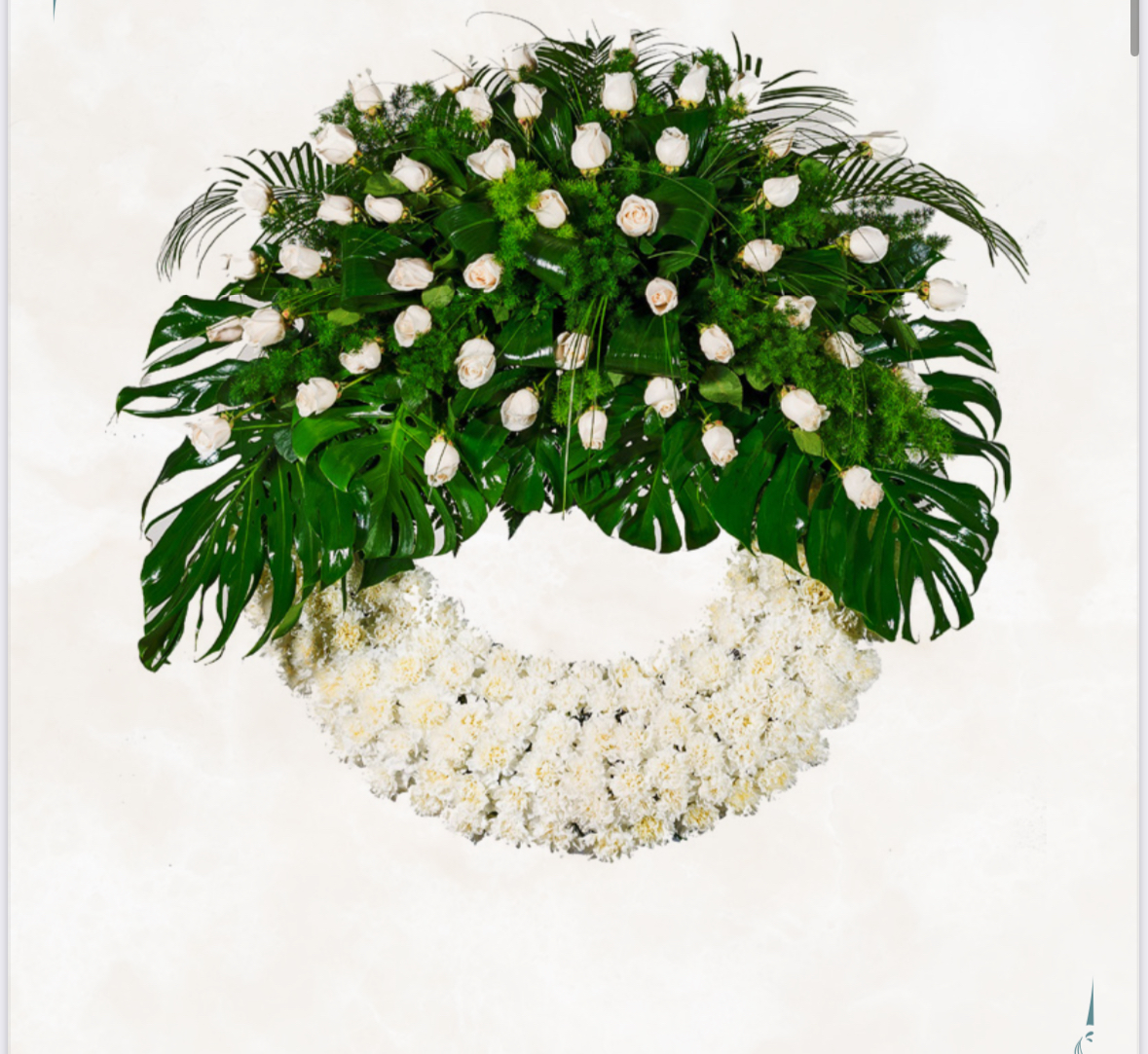 Corona de difunto con aro de clavel y rosas en cabezal todo en tonos blancos