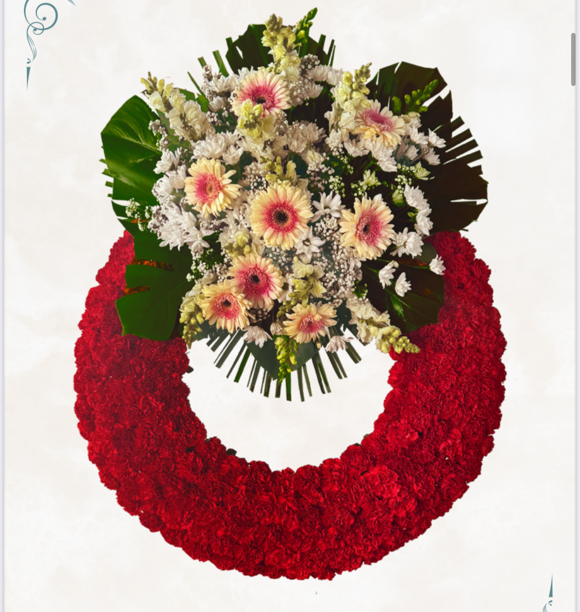 Corona de difunto con aro de clavel y flor de temporada en cabezal