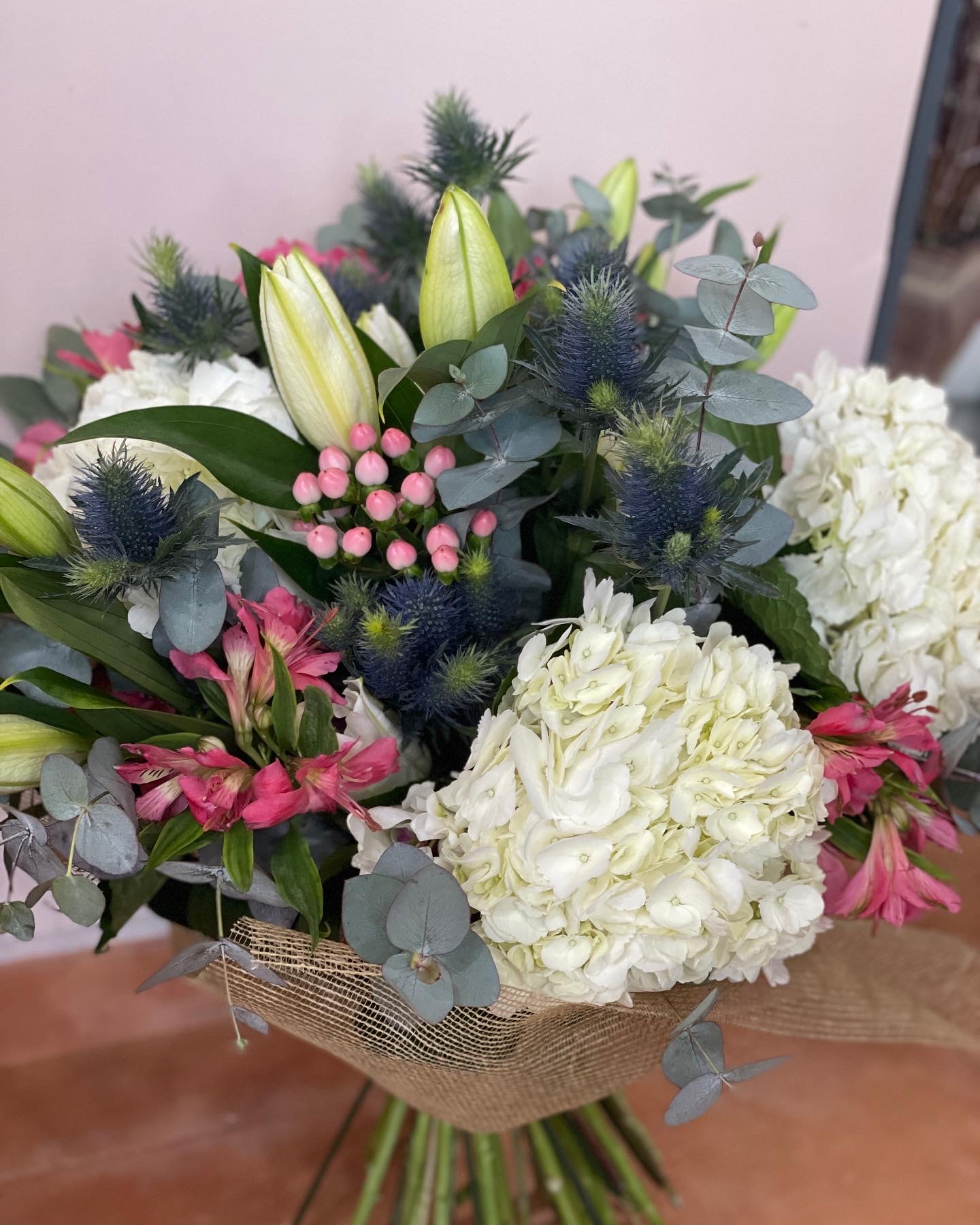 Ramo con flor de temporada con hortensias, lilium, alstroemeria y flor variada