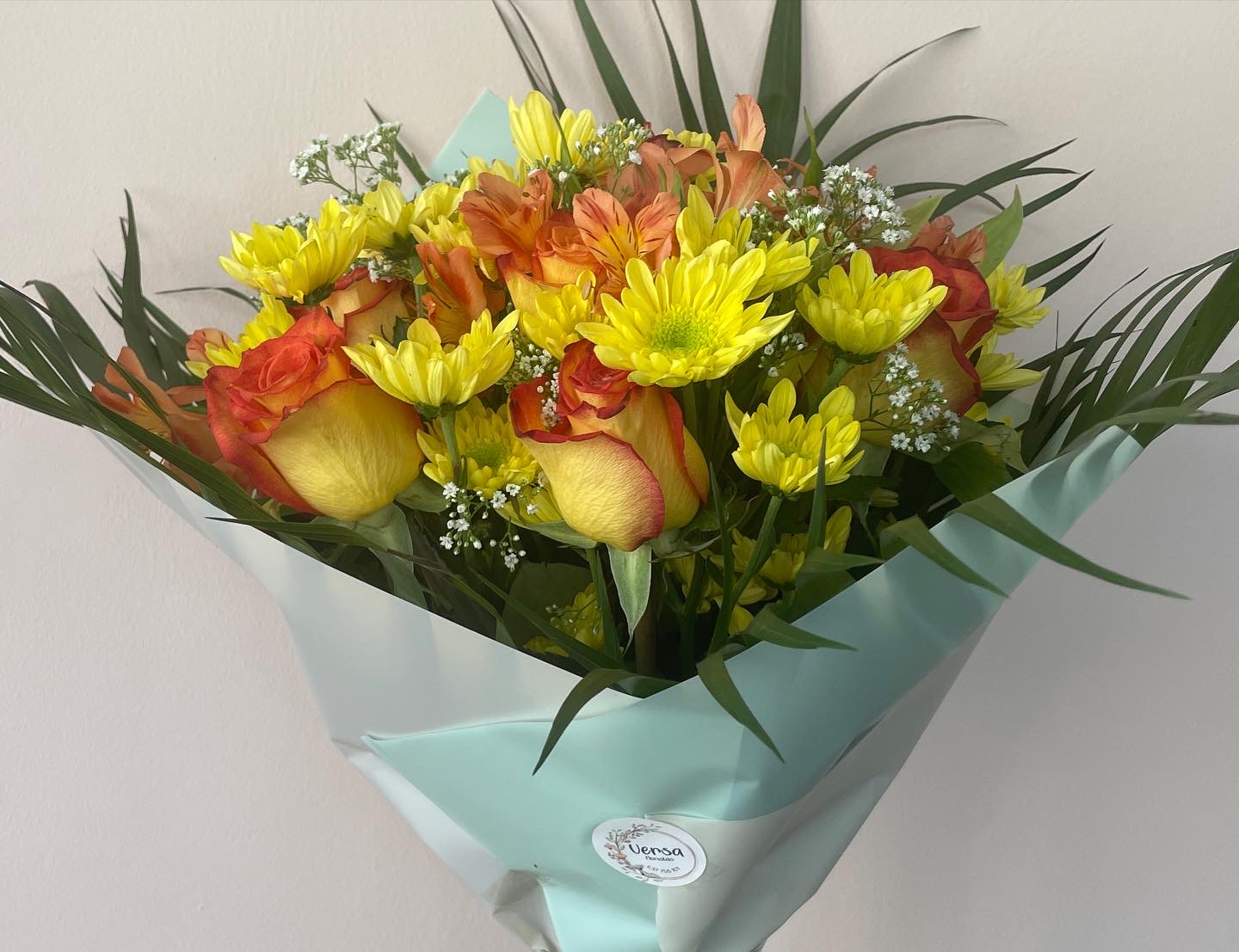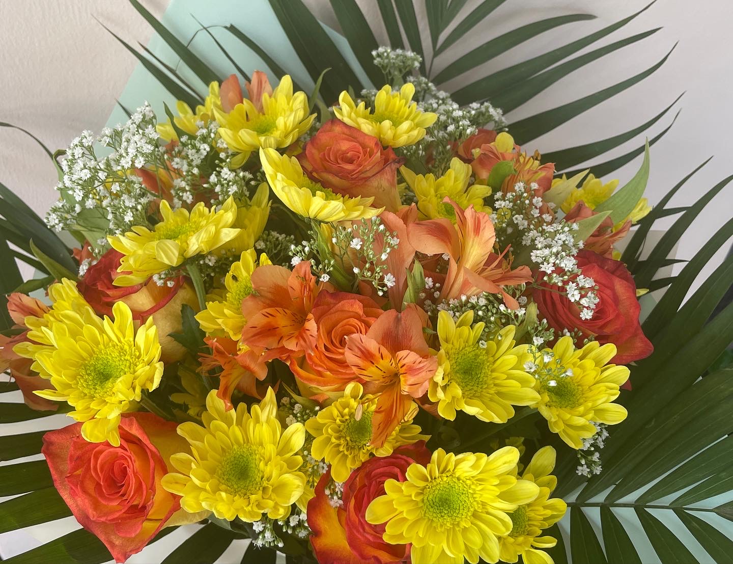 Ramo con flor de temporada en tonos amarillos como rosas, margaritas y alstroemerias